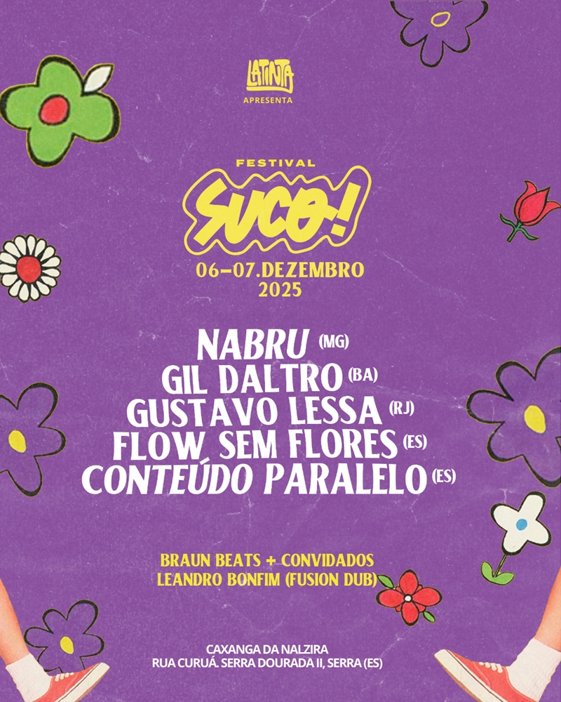 O Festival SUCO! será realizado nos dias 6 e 7 de dezembro de 2025, na Caxanga da Nalzira, sede do Ponto de Cultura Latinta, em Serra Dourada II, Serra-ES. O evento, totalmente gratuito, reúne apresentações musicais, exposição de arte, encontro de beatmakers, rodas de conversa e bate-papos.